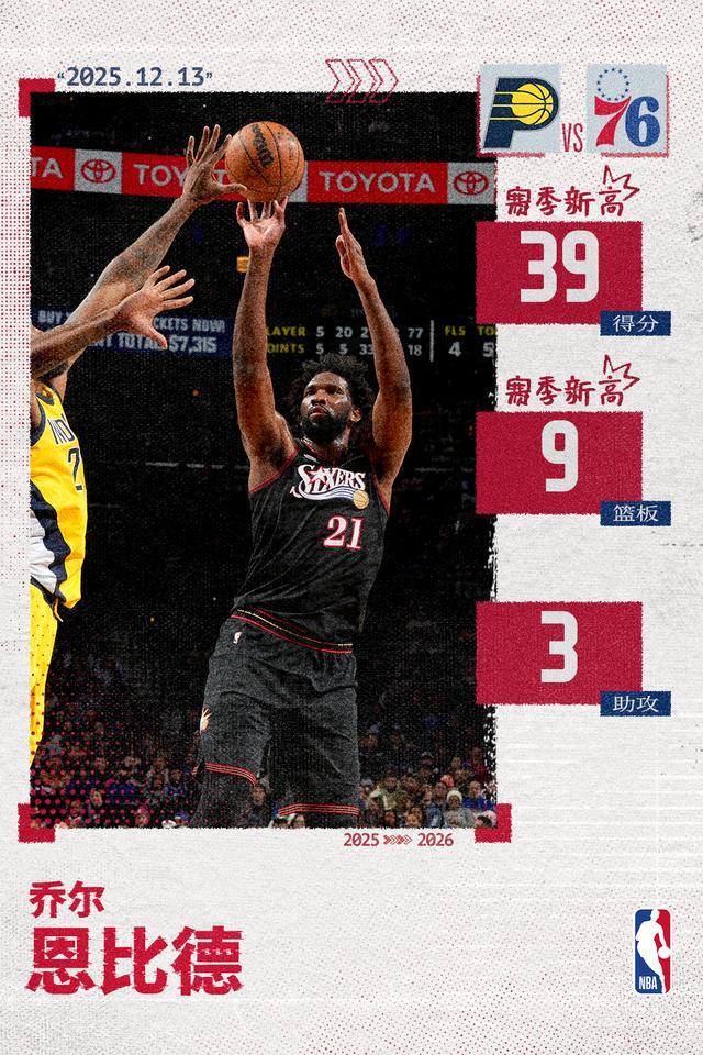 北京時間12月13日,費城76人在主場以115-105力克印第安納步行者避免連敗,喬爾-恩比德此役23中12狂轟39分9籃板3助攻,得分與籃板均創賽季新高。